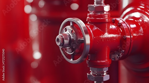 Photograph of a red valve on a textured background with a circular handle and metallic accents.