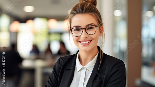 photograph of a stunning young female accountant with a warm smile, looking directly at the camera. She is wearing a professional suit and glasses. Her hair is neatly tied back in a bun.