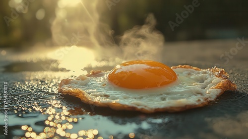 Photograph of a sunny-side-up fried egg on the asphalt, with morning sunlight and a bokeh effect. Copy space