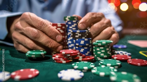 photograph of closeup of mans hands holding poker chips at casino table gambling concept illustration