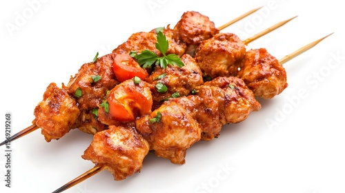 Photograph of grilled meat skewers with tomato and parsley, served on white.