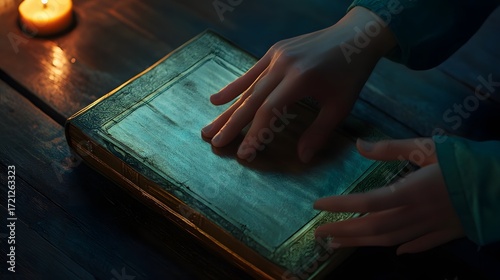 Photograph of hands resting on an ornate, teal-colored book illuminated by warm candlelight.