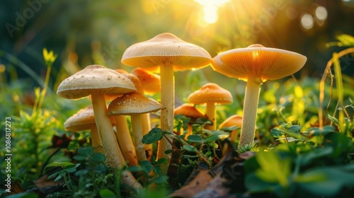 photograph of Mushroom plants. Brightly glowing mushrooms in a forest. Mushrooms in a wood. Mushroom in a forest on sunrise. Magic mushroom in the forest.