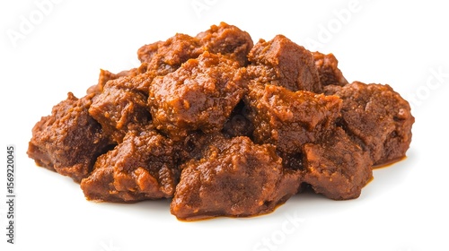 Photograph of rustic, dark meatball dish in tomato sauce, served on a white background.