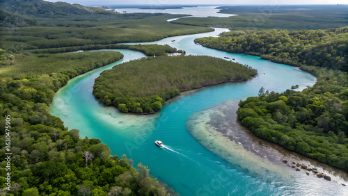 photograph showcasing a vibrant, winding river with clear turquoise water, surrounded by lush green vegetation. The river curves gracefully through the image.