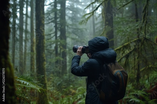 Photographer Capturing Nature Amidst Lush Green Forest Environment
