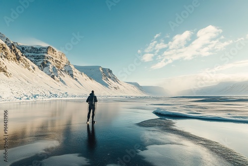 Photographer capturing the Northern Lights in Iceland, dramatic colors in the sky, cold lighting, icy landscape with mountains.