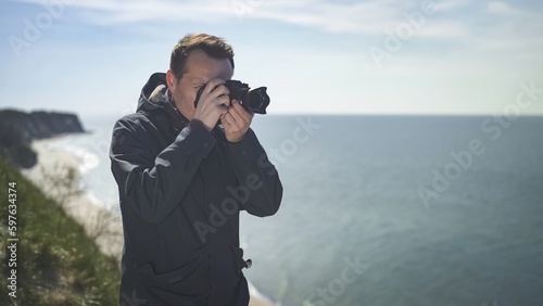 photographer on a cliff against the background of the sea