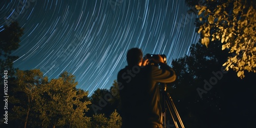 Photographer taking a long exposure shot of the night sky, capturing star trails and constellations.