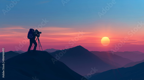 ''photographer taking a picture of a beautiful landscape, sun setting in the background, colorful illustration with details''