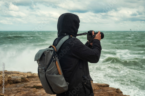 Photographer taking picture of a stormy sea