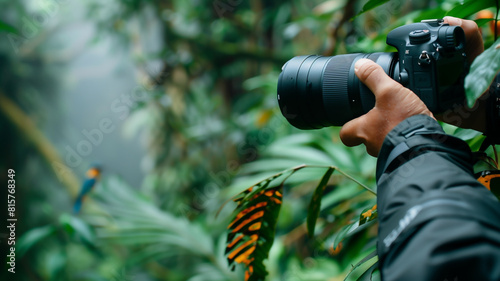Photographer with digital camera takes pictures in the forest for documentaries, conservation, travelogues, photography.