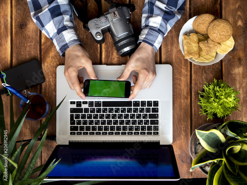 photographer working using phone and laptop on a wooden table