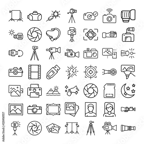 Photography Equipment Icons Cameras, Lenses, Lighting, and Accessories