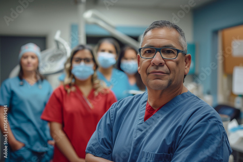Photography of a USA group of dental clinic workers with the dentist in front.
