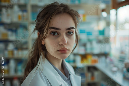 Photography of smiling pharmacist in a pharmacy store generative ai