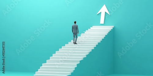 Photorealistic 3D CGI of Businessman Climbing Staircase with Upward Arrow on Teal Background