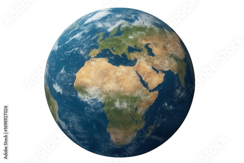 Photorealistic 3d earth rotating, revealing europe, africa, asia landmasses against transparent backdrop, enabling seamless digital composition