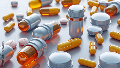 Photorealistic 3D Illustration of Pharmaceutical Packaging with Orange Tablets and Capsules