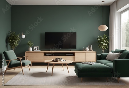 Photorealistic 3D visualization of a modern, cozy living room with a large, plush gray sofa, a sleek TV cabinet in a rich wood tone