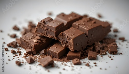 Photorealistic close-up of chocolate bar broken into pieces, rich brown tones, sharp texture detail, isolated, no text, no packaging