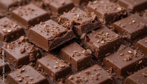 Photorealistic close-up of chocolate bar broken into pieces, rich brown tones, sharp texture detail, isolated, no text, no packaging