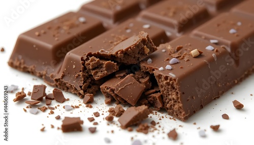 Photorealistic close-up of chocolate bar broken into pieces, rich brown tones, sharp texture detail, isolated, no text, no packaging