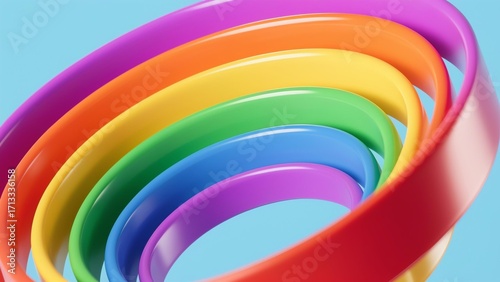 Photorealistic curved glossy rainbow-colored 3D ribbons in semi-circular layout, original color order preserved, light blue background, smooth metallic luster