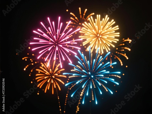 Photorealistic fireworks with pink, orange, yellow, blue radial bursts on black background, shifted blue burst, subtle spark trails