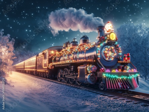 Photo-realistic image of a magical steam train adorned with colorful lights along the front, elegantly pulling through a snowy winter landscape. The train's engine is detailed and classic