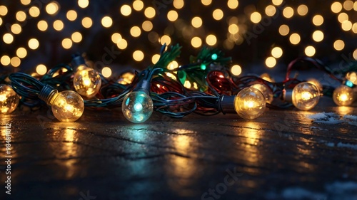 Photorealistic image of Christmas lights on a winter night. Detailed textures, accurate lighting, realistic atmosphere, perfect for Christmas