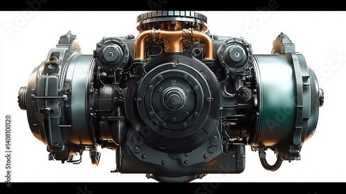 Photorealistic industrial engine 3D rendering with intricate mechanical parts and dramatic lighting