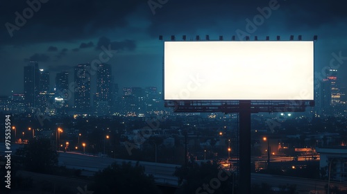 Photo-realistic mock-up of a white blank billboard glowing against a city skyline under the night sky