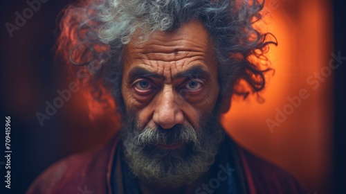 Photorealistic Old Persian Man with Brown Curly Hair Futuristic Illustration. Portrait of a person in cyberpunk style. Cyberspace Ai Generated Horizontal Illustration.
