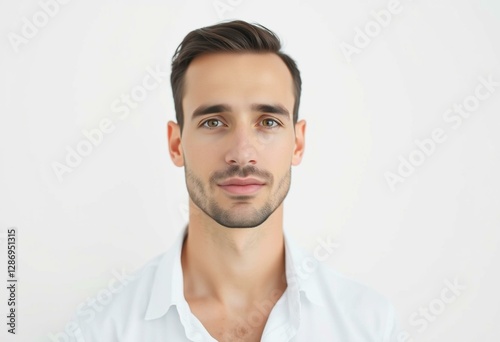 Photorealistic portrait of a male with neutral makeup and simple clothing