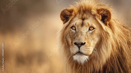 Photorealistic portrait of African lion making direct eye contact, golden fur glowing in natural light, blurred savanna background, symbolizing wildlife conservation and endangered species awareness