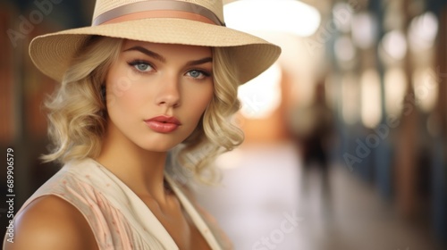 Photorealistic Teen Latino Woman with Blond Straight Hair Vintage Illustration. Portrait of a person wearing hat, retro 20s movie style. Retro fashion. Ai Generated Horizontal Illustration.