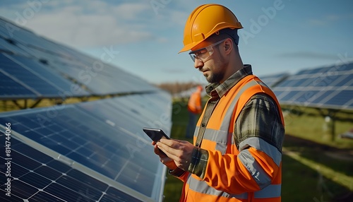 Photovoltaic engineer or technician using smartphone at solar power plant