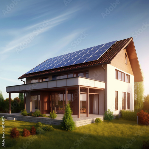 Photovoltaic or solar panels on a detached home with a yard in front of a beautiful sky. Generative AI.