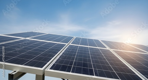 Photovoltaic solar panels array generating clean renewable energy under a blue sky.