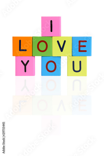 Phrase I LOVE YOU formed from wooden letter blocks