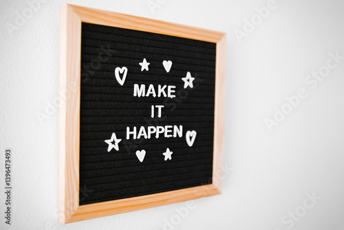 Phrase "Make It Happen" in white letters on a wooden and black felt board hanging on a white wall
