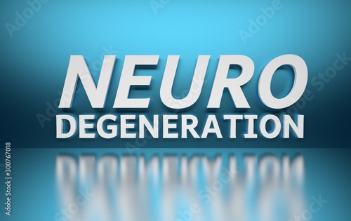 Phrase words Neuro degeneration written in bold white letters on blue reflective background. 3d illustration.