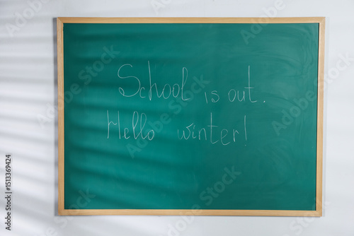 Phrases School Is Out and Hello Winter with exclamation mark on blackboard