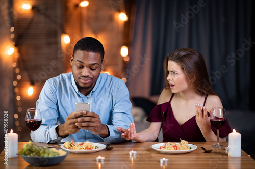Phubbing Concept. Black Man Busy With Smartphone During Dinner With His Girlfriend