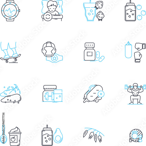 Physical fitness linear icons set. Endurance, Strength, Flexibility, Cardio, Agility, Speed, Stamina line vector and concept signs. Power,Mobility,Health outline illustrations