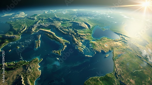 Physical map of Planet Earth, centered on the Mediterranean Sea. Satellite view of Southern Europe and North Africa with the sun shining on the horizon. 3D illustration.