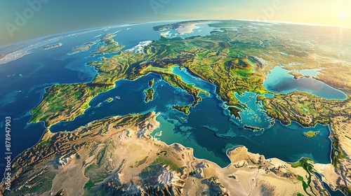 Physical map of Planet Earth, centered on the Mediterranean Sea. Satellite view of Southern Europe and North Africa with the sun shining on the horizon. 3D illustration.