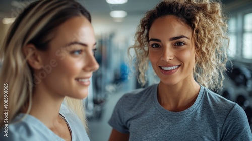 Physical therapist guiding patient through rehabilitation exercises using resistance bands in bright, equipment-filled workout space