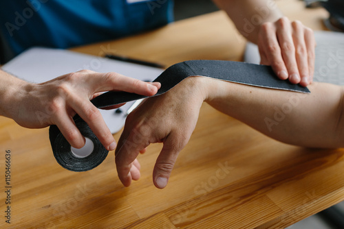 Physician preparing kinesiology tape for arm treatment on a patient. Close up.